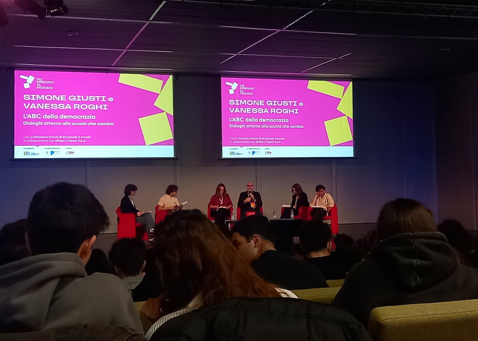 Ore 11, uscita di evacuazione, dalla scuola all’Auditorium Paganini: tanti studenti, qualche insegnante e due cattivi maestri. Vanessa Roghi e Simone…