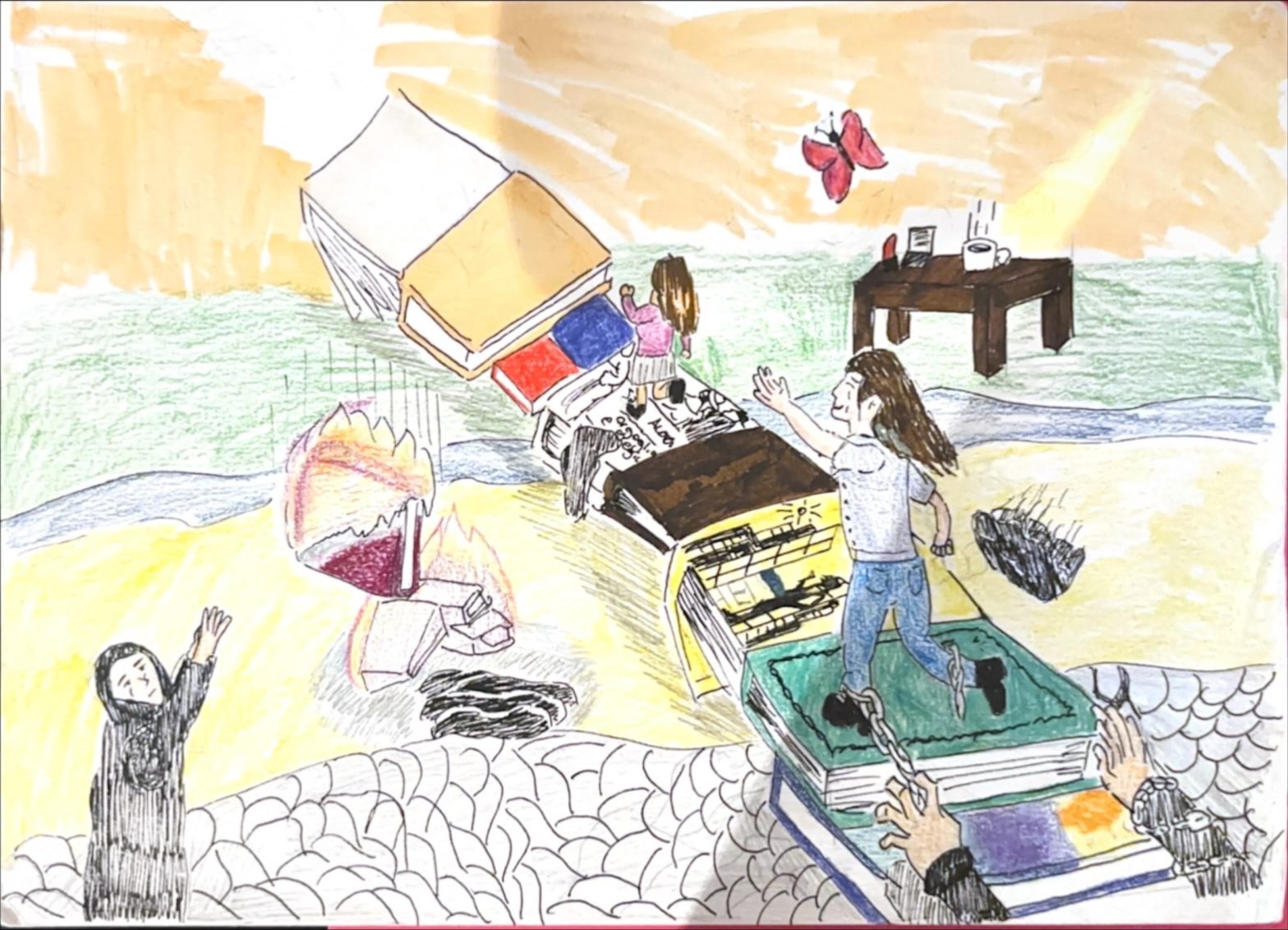 Inoltre, possiamo scorgere tre livelli del disegno: un livello roccioso, che rappresenta la durezza del regime e delle sue imposizioni, uno sabbioso in cui bruciano degli scritti e dei veli buttati a terra, ed un prato più naturale ed aperto che simboleggia l’indipendenza; disposto in uno spazio ascendente.