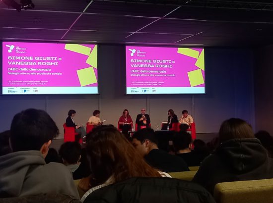 Ore 11, uscita di evacuazione, dalla scuola all’Auditorium Paganini: tanti studenti, qualche insegnante e due cattivi maestri. Vanessa Roghi e Simone…